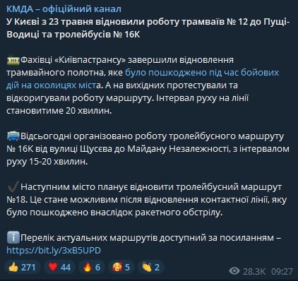В Киеве впервые с начала широкомасштабного вторжения РФ заработал трамвай на Пущу-Водицу. Специалисты "Киевпасстранса" завершили восстановление трамвайного полотна, которое было повреждено во время боевых действий в окрестностях города.