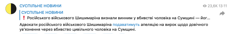 Адвокаты российского военного Владимира Шишимарина подадут апелляцию на приговор о пожизненном заключении за убийство мирного жителя в Сумской области.