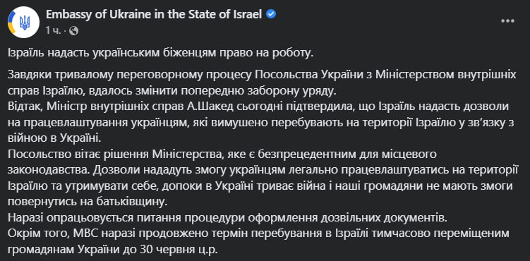 Израиль предоставит украинским беженцам право официального трудоустройства. Соответствующее решение подтвердила глава МВД Израиля Айелет Шакед.