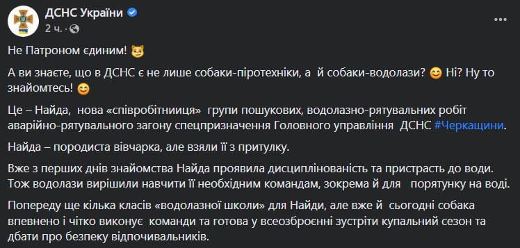 У пса Патрона, который помогает черниговским саперам, появилась коллега - Найда. Собака является "сотрудницей" группы поисковых водолазно-спасательных работ аварийно-спасательного отряда Черкасской области.