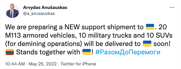 "Мы готовим новую партию поддержки Украины. 20 бронетранспортеров М113, 10 военных грузовиков и 10 внедорожников (для разминирования) скоро будут доставлены в Украину!" – написал Анушаускас.