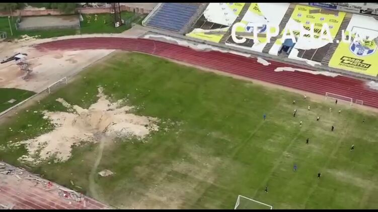 На одном из городских стадионов в центре поля видна огромная воронка от ракеты, при этом рядом мужчины играют в футбол.