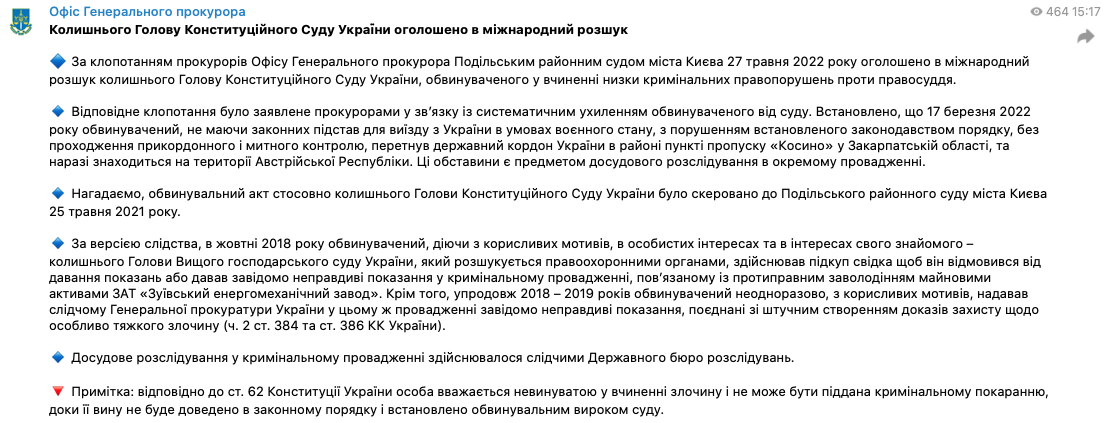 Генпрокуратура сообщила, что в международный розыск объявлен бывший председатель Конституционного Суда Украины. Его имя не уточняется, но очевидно, что речь идет об Александре Тупицком, у которого 15 мая закончился срок полномочий.