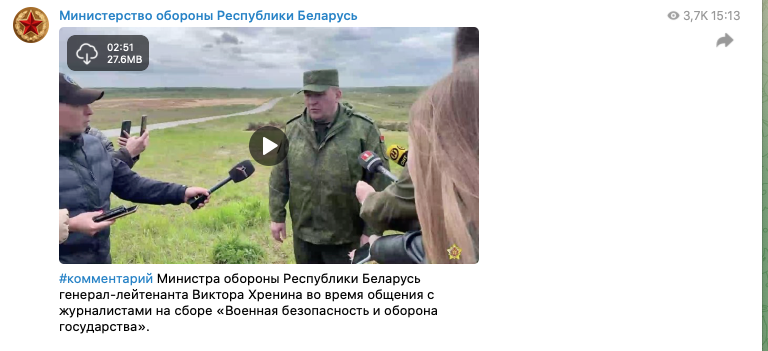 Об этом сообщил министр обороны РБ Виктор Хренин.