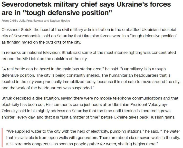Отметим, что в Минобороны заявляют, что хоть ситуация в Северодонецке и сложная, но украинская армия даёт мощный отпор.