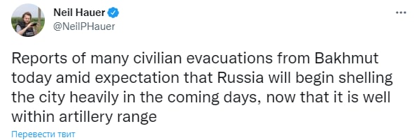 Тем временем из Бахмута идет массовая эвакуация населения. Ждут, что Россия будет если не штурмовать, то сильно обстреливать город, который уже в досягаемости ее артиллерии.