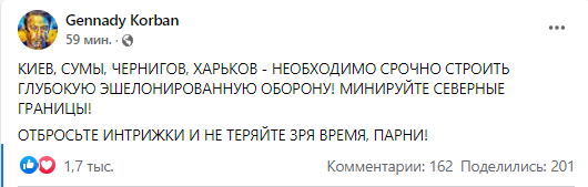 Позже Корбан в комментарии "Стране" объяснил свой пост на Фейсбуке, в котором он призвал власть отбросить все интриги и укреплять Северные границы Украины.