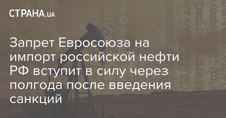 Запрет на импорт сырой нефти из РФ в ЕС начнёт действовать через полгода после введения санкций в силу, запрет на нефтепродукты, зависимость Европы от которых, в частности, по поставкам дизеля из РФ, особенно велика - через 8 месяцев.