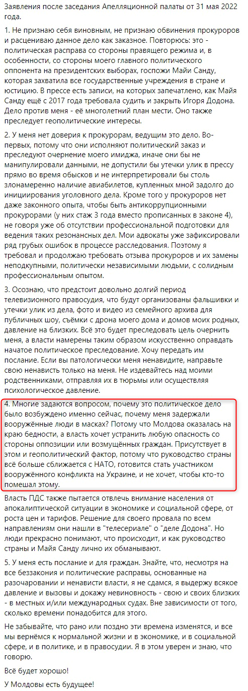 "Присутствует в этом (деле - Ред.) и геополитический фактор, потому что руководство страны всё больше сближается с НАТО, готовится стать участником вооружённого конфликта на Украине, и не хочет, чтобы кто-то помешал этому", - написал Додон у себя в Facebook.