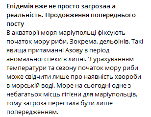 "Эпидемия уже не просто угроза, а реальность. Море на сегодняшний день одно из немногих мест гигиены для мариупольцев, поэтому угроза перестала быть лишь предупреждением", - говорится в сообщении.