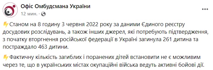 08:43 По меньшей мере 261 ребенок погиб и 463 пострадало из-за боевых действий в Украине.