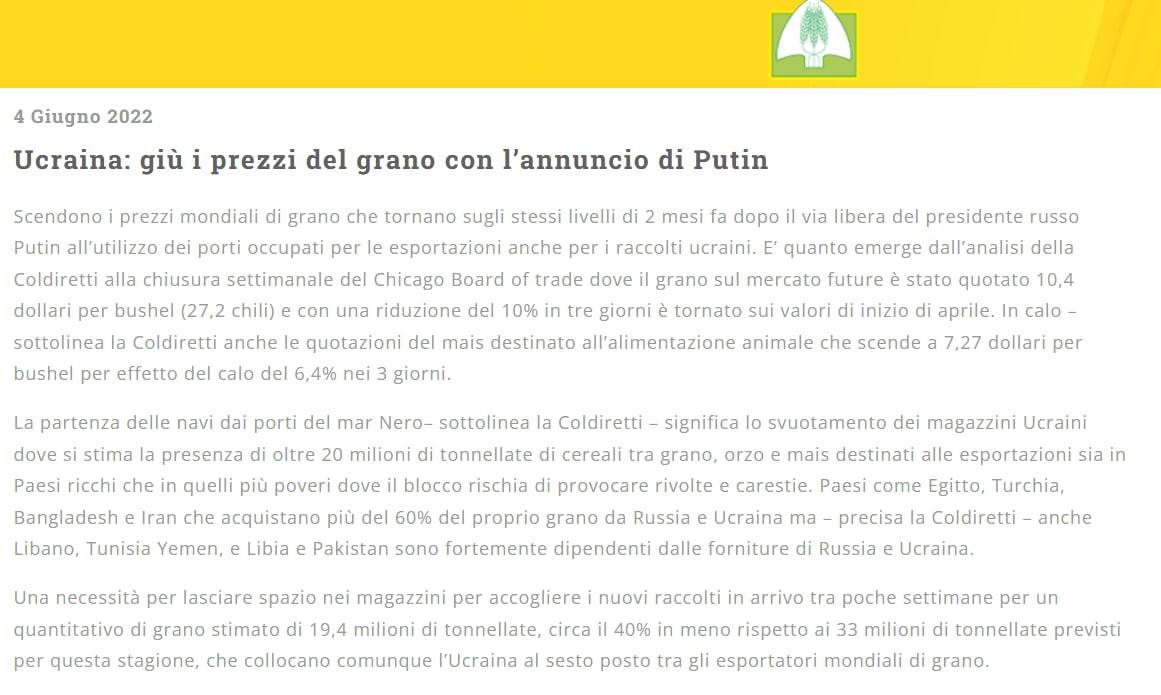 Это следует из анализа Coldiretti на еженедельном закрытии Чикагской торговой палаты, где пшеница на фьючерсном рынке котировалась на уровне 10,4 доллара за бушель (27,2 кг). Цены на кукурузу для корма для животных также падают до 7,27 доллара за бушель - снижение на 6,4% за 3 дня.