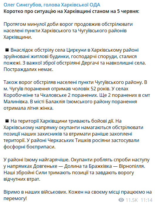 Глава Харьковской областной военной администрации Олег Синегубов сообщил о ситуации в области по состоянию на воскресенье, 5 июня.