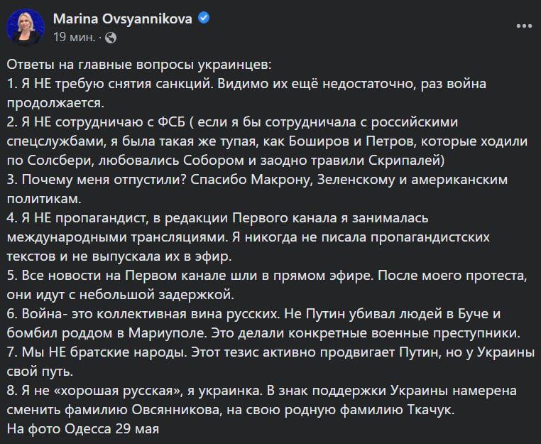 Бывшая работница "Первого канала" Марина Овсянникова, отвечая на обвинения со стороны украинцев, заявила, что является украинкой а не русской, и что собирается сменить фамилию на девичью - Ткачук.