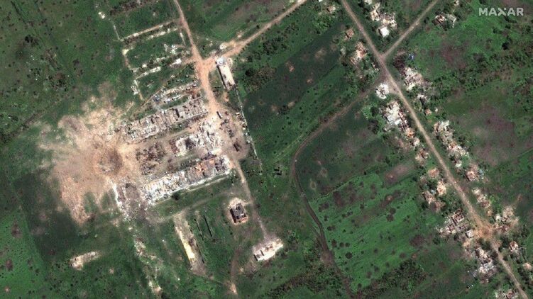 Maxar Technologies публикует фото поля в районе села Долгенькое, изрешеченного снарядами, а также огромную воронку от взрыва в самом селе.