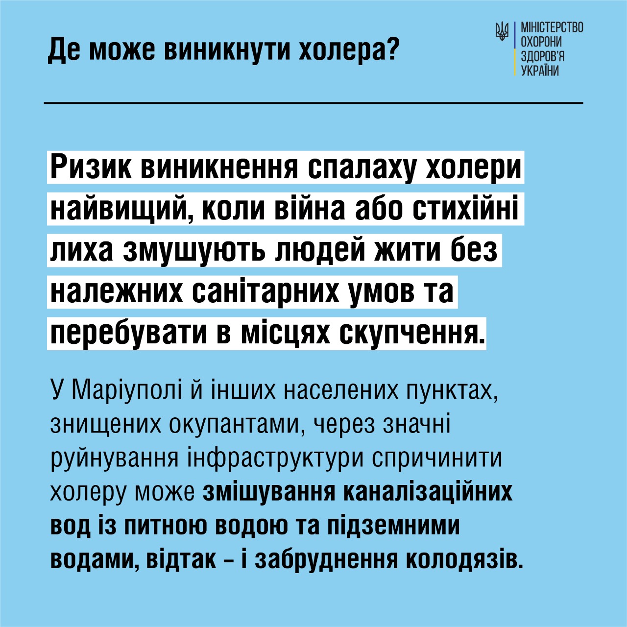 Несмотря на то, что в настоящее время вспышки, в частности, холеры, не зафиксированы, опасность связана с тем, что в Мариуполе и других уничтоженных россиянами городах из-за разрушений происходит смешивание канализационных вод с питьевой водой и подземными водами, поэтому происходит и загрязнение колодцев.