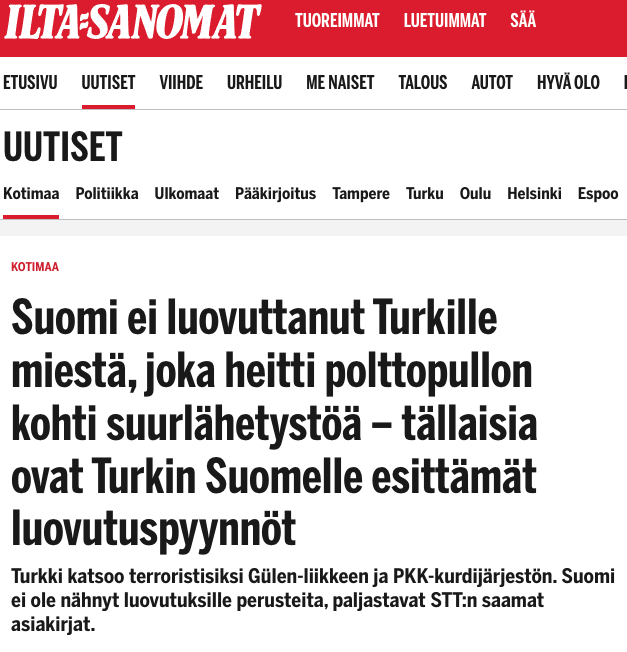 И еще Турция хотела экстрадировать одного из мужчин, осужденных за нападение на ее посольство в Хельсинки, но тоже получила отказ.