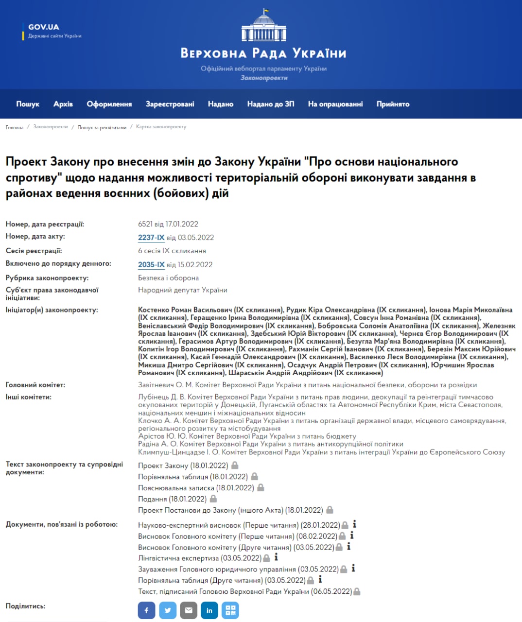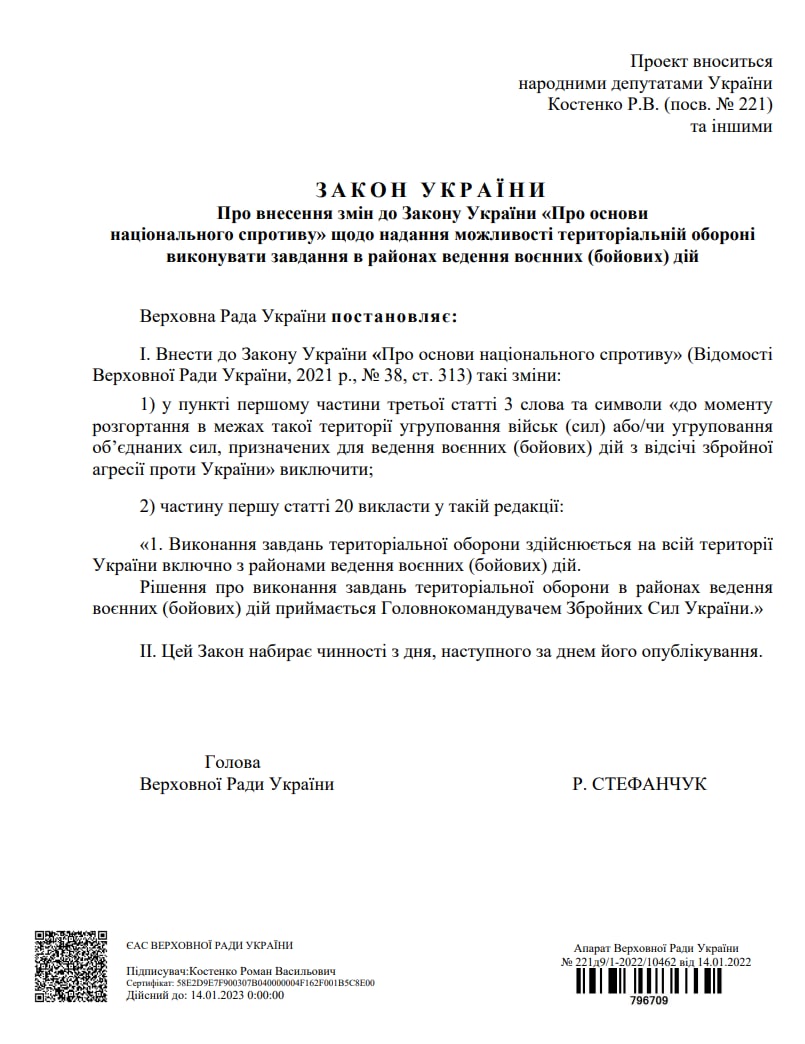 Президент Владимир Зеленский подписал закон №6521, которым теробороне предоставляется возможность выполнять задачи в районах военных действий.