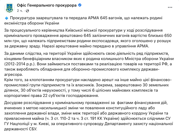 Генпрокуратура арестовала 645 жд/вагонов экс-министра обороны времен Януковича, который работает на ВПК РФ