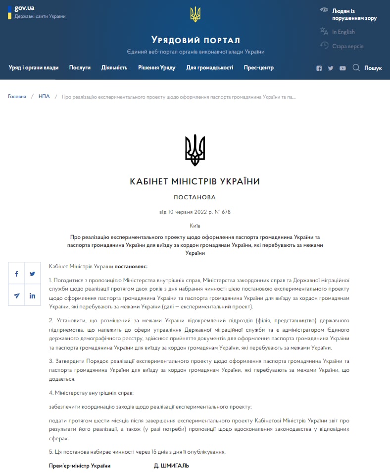 Кабмин разрешил выдачу паспорта гражданина Украины и загранпаспорта за границей.