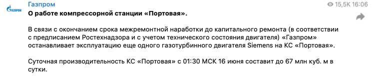 "В связи с несвоевременным возвратом компанией Siemens (Германия) газоперекачивающих агрегатов из ремонта, выработкой межремонтного ресурса ГПА и выявленными техническими неисправностями двигателей (получено предписание Ростехнадзора о временном запрете деятельности) в настоящее время на КС "Портовая" может быть использовано только три газоперекачивающих агрегата", - сообщила компания в своем телеграм-канале.