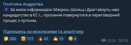 "Если версия Андрусива верна, то это значит, что ведущие европейские страны продолжают продвигать для Киева тему "перспектива вступления Украины в ЕС в обмен на мир с Россией". Эта тема обсуждалась еще в марте, когда велись интенсивные переговоры между Украиной и РФ. И, не исключено, жива до сих пор. Вопрос только, насколько обе воюющие страны согласятся с таким подходом", - делает выводы Телеграм-канал "Политика Страны".
