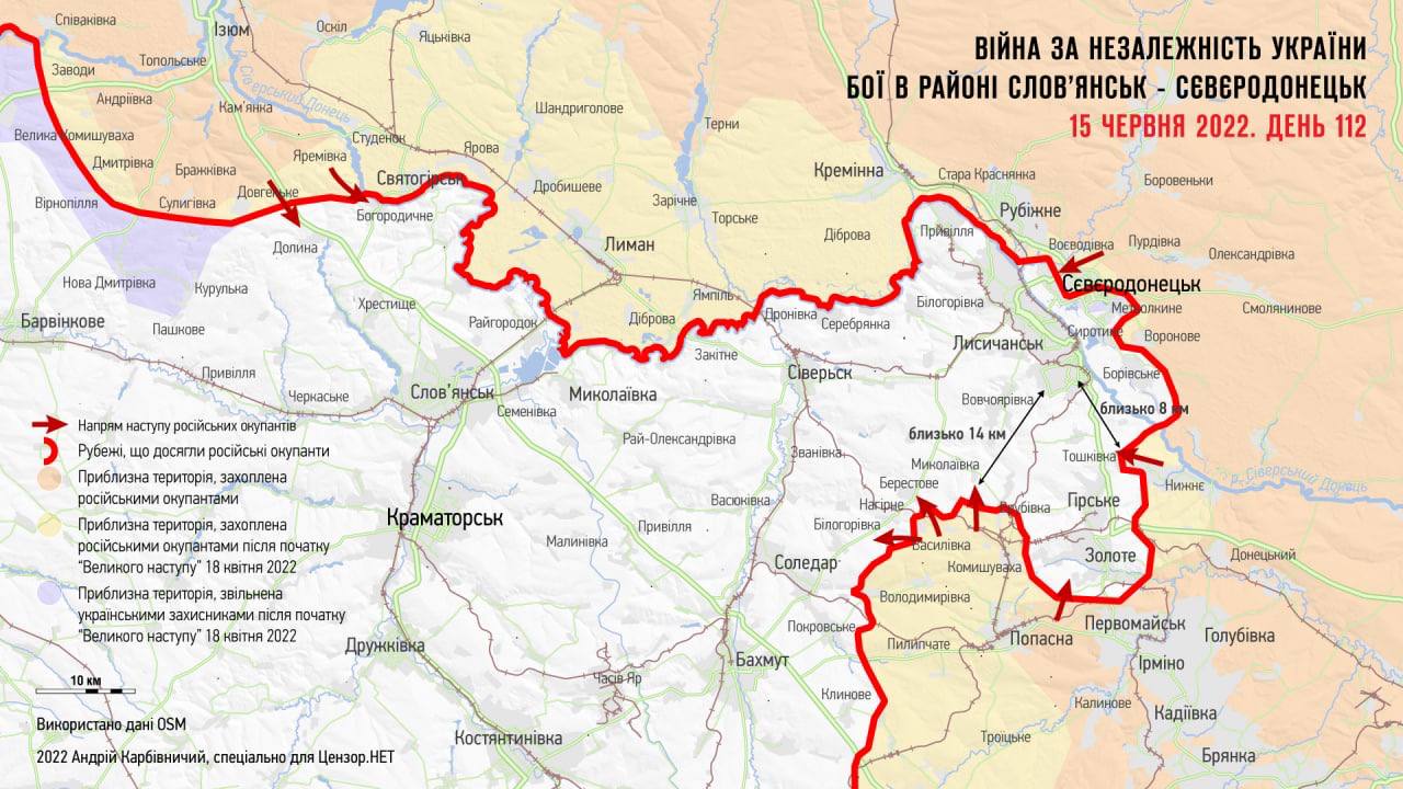 С востока на запад враг атакует по линии Северодонецк - Лисичанск, а также на направлениях Северодонецк-Метелкино, Тошковка-Камышеваха.