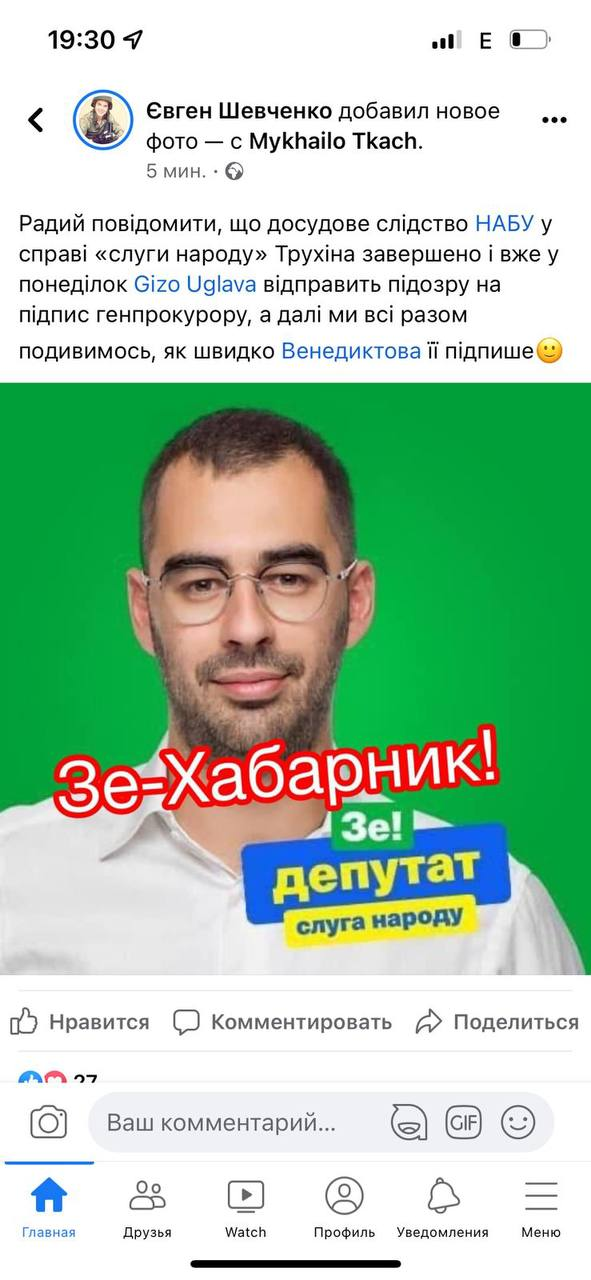 "Рад сообщить, что детективы НАБУ по делу "слуги народа" Трухина провели все необходимые следственные действия и готовы сообщить ему о подозрении, проект которого в понедельник Гизо Углава (и.о. главы НАБУ - Ред.) отправит на подпись генпрокурору, а дальше мы все вместе посмотрим, как быстро Венедиктова ее подпишет", – сообщил он.