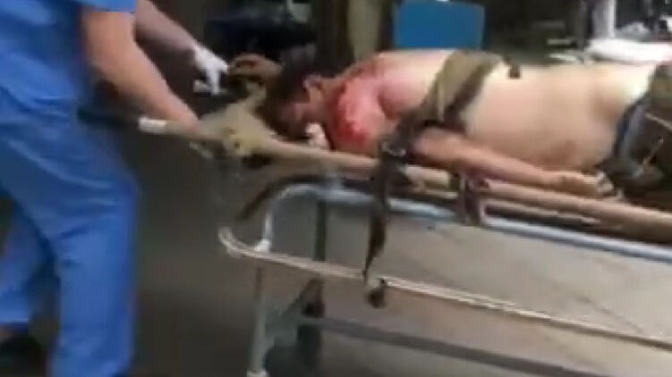 На видео видно, как везут раненого бойца на носилках. Судя по видео, у него несколько осколочных ранений.