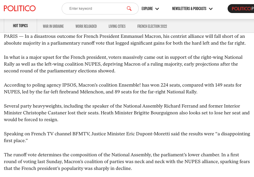 Издание Politico называет исход французских парламентских выборов "катастрофическим" для Эммануэля Макрона. Его центристский блок "Вместе" потерял абсолютное большинство, а левые (Жан-Люк Меланшон) и правые (Марин Ле Пен) нарастили свои позиции.