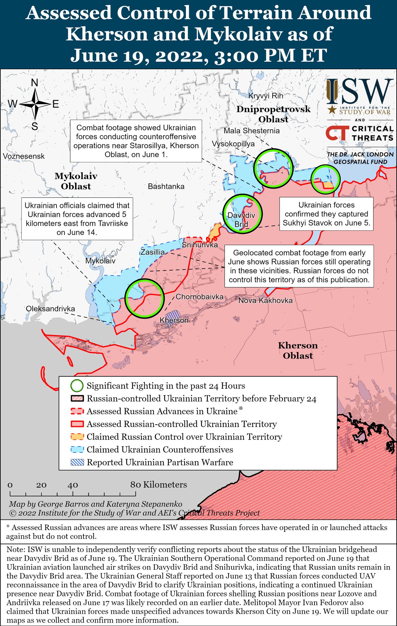 В ночь на 20 июня американский Институт изучения войны опубликовал актуальные карты боевых действий в Украине. Сообщается, что сосредоточенных сил российской артиллерии в сочетании с малочисленными пехотными подразделениями по-прежнему недостаточно для успешного наступления в Северодонецке.