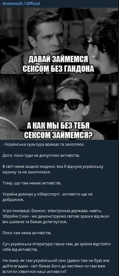"Не знаю, как там украинский секс (давно там не был), дайте угадаю - мир желает его до беспамятства, или там уже успели появиться активисты?", - подытожил Арестович.