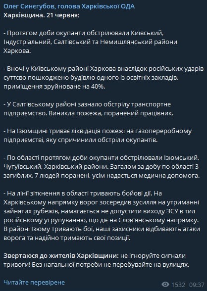 08:00 Сводка Генерального штаба ВСУ на утро 21 июня. Ключевые моменты: