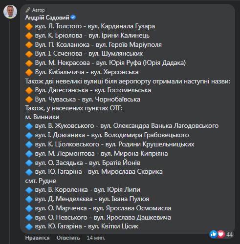 Львов. Горсовет переименовал 8 улиц в областном центре и 11 в населенных пунктах громады, сообщил мэр Андрей Садовой.