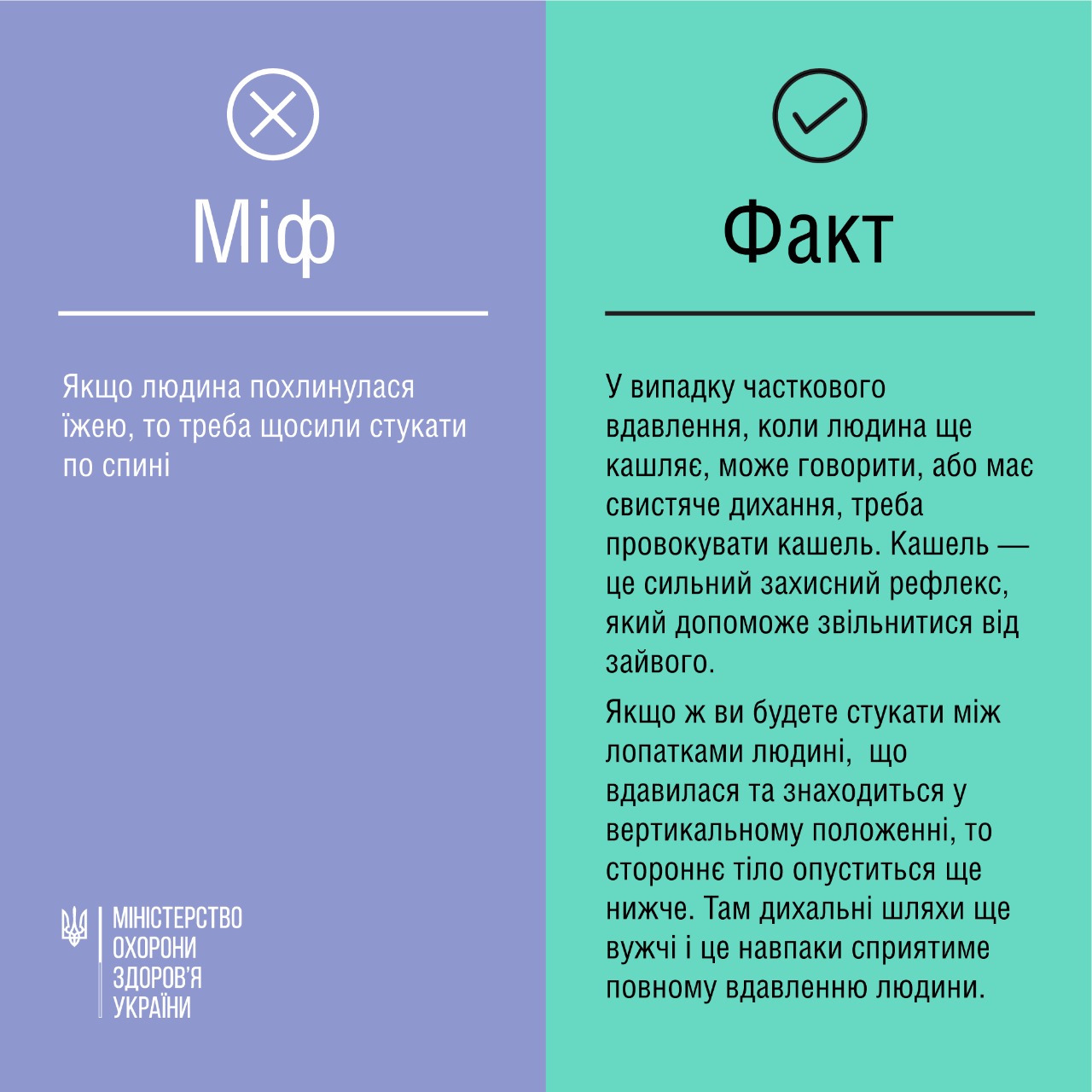Не надо стучать по спине, если человек подавился. Соответствующий миф о домедицинской помощи развенчали специалисты МОЗ у себя в Facebook.