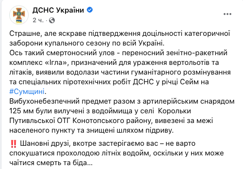 В реке под Сумами нашли ПЗРК и артиллерийский снаряд. Украинцев призывают воздержаться от купания. Фото