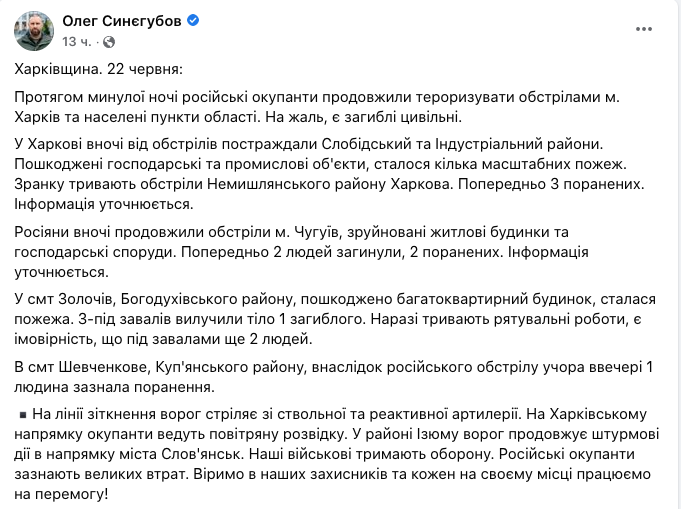 В Харьковской области 22 июня погибли 10 мирных жителей - губернатор