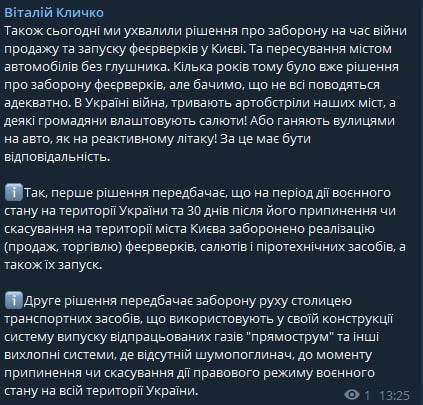 Первое решение предусматривает, что на период действия военного положения на территории Украины и 30 дней после его прекращения или отмены на территории города Киева запрещена реализация (продажа, торговля) фейерверков, салютов и пиротехнических средств, а также их запуск.