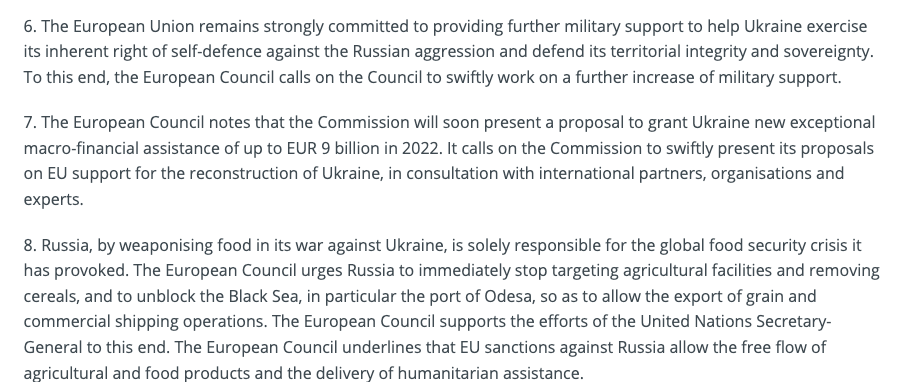 Россию в Европе призвали "немедленно прекратить нацеливаться на сельскохозяйственные объекты и вывоз зерновых, а также разблокировать Черное море, в частности, порт Одессы, чтобы разрешить экспорт зерна и коммерческие судоходные операции".