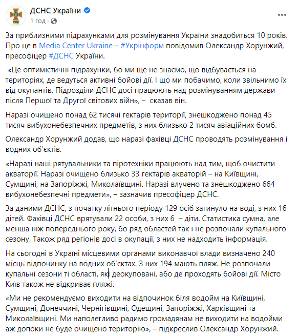 Также он порекомендовал украинцам на выходить на отдых у водоемов в Киевской, Сумской, Донецкой, Черниговской, Одесской, Запорожье, Харьковской и Николаевской до тех пор, пока там территория не будет очищена от взрывоопасных предметов.