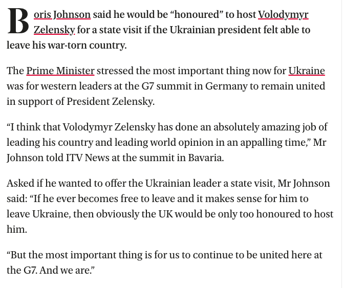 По данным The Sunday Times, что британский премьер рассматривает возможность предложить Зеленскому государственный визит, включая встречу с королевой. По сообщению газеты, представители консерваторов также хотели бы, чтобы он выступил на партийной конференции в октябре, возможно, по видеосвязи.