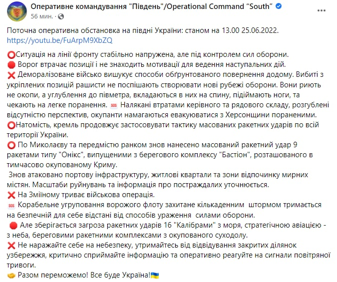 Ранее мы писали, что 23 июня российские войска ударили по Николаевской области тремя крылатыми ракетами, которые были запущены с территории Херсонской области. От обстрела пострадал мирный житель, разрушена производственная и социальная инфраструктура.