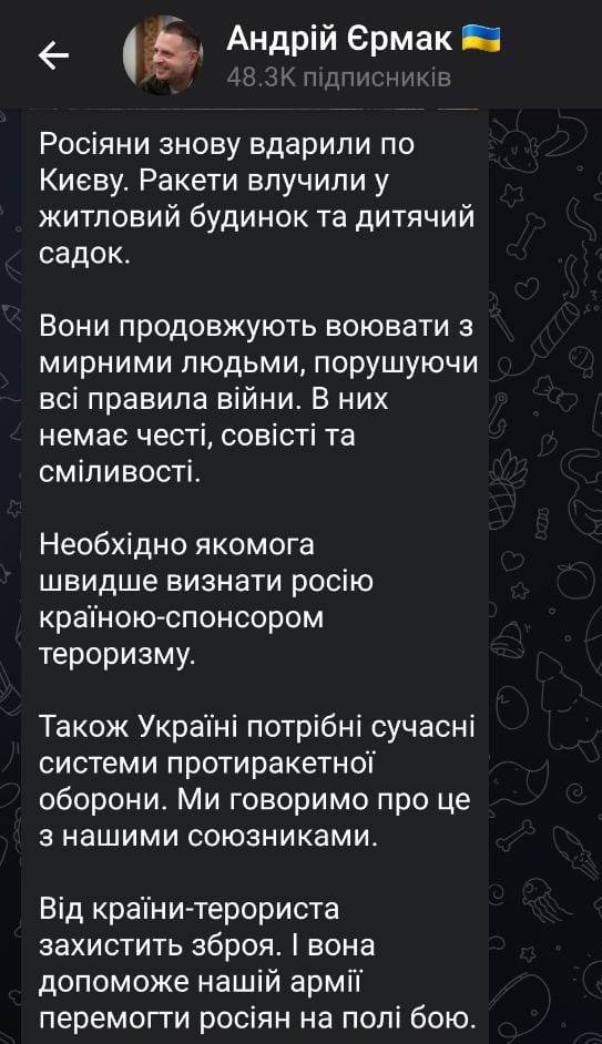 8.00 Советник главы МВД Антон Геращенко подтвердил, что ракетой снесло несколько верхних этажей 9-этажного дома в Шевченковском районе Киева.