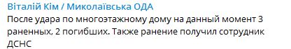 "После удара по многоэтажному дому на данный момент 3 раненных, 2 погибших. Также ранение получил сотрудник ДСНС" - написал Ким.