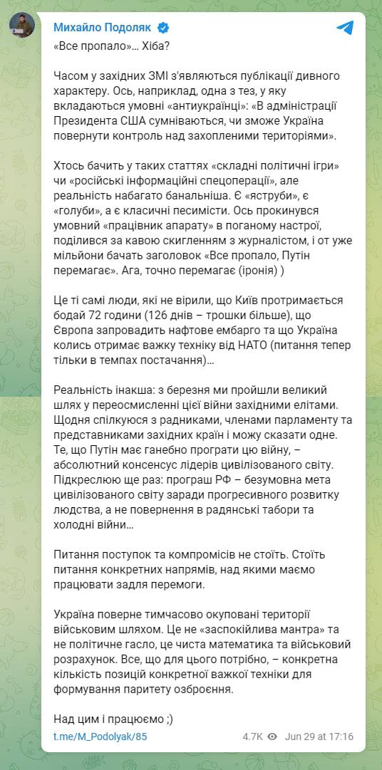 "Есть "ястребы", есть "голуби", а есть классические пессимисты. Вот проснулся условный "работник аппарата" в плохом настроении, поделился за кофе нытьем с журналистом, и вот уже миллионы видят заголовок "Все пропало, Путин побеждает", - написал Подоляк в Telegram-канале.