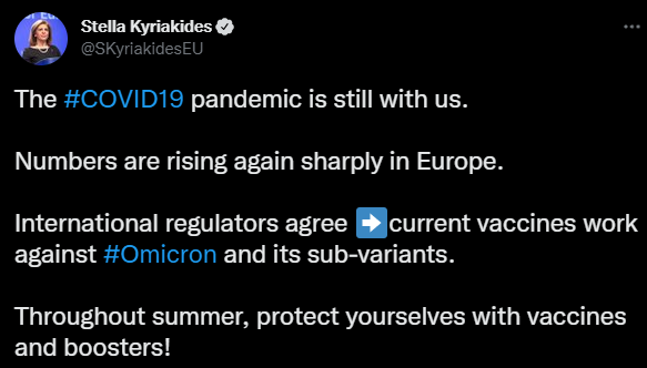 "Пандемия COVID-19 все еще с нами. Цифры снова резко растут в Европе", - написала она в своем Twitter.