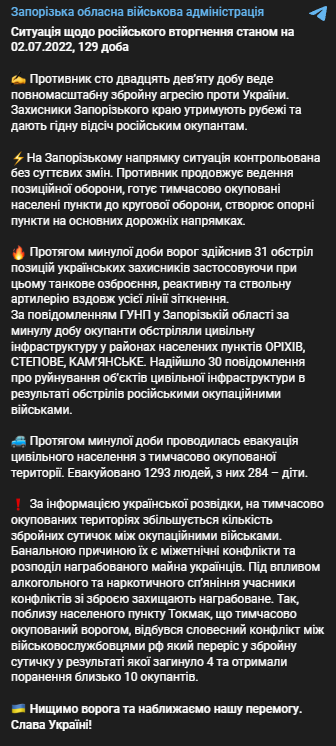 За прошедшие сутки враг осуществил 31 обстрел позиций украинских защитников, применяя при этом танковое вооружение, реактивную и ствольную артиллерию вдоль всей линии столкновения. По сообщению ГУНП в Запорожской области за минувшие сутки оккупанты обстреляли гражданскую инфраструктуру в районах населенных пунктов Орехов, Степное, Каменское.