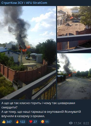 "А что это так классно горит и почему так шкварками воняет? А это потому, что наши пушкари в оккупированной Ясиноватой попали в казарму с орками" - говорится в сообщении в Telegram-канале Страткома ВСУ.
