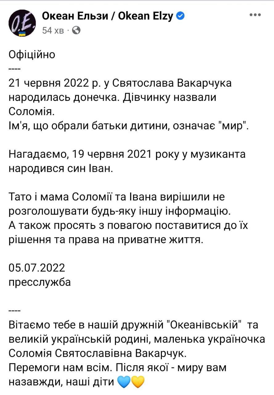 У лидера группы "Океан Эльзы" Святослава Вакарчука родилась дочка. Девочка появилась на свет 21 июня. Ее назвали Соломия. Это второй ребенок музыканта.