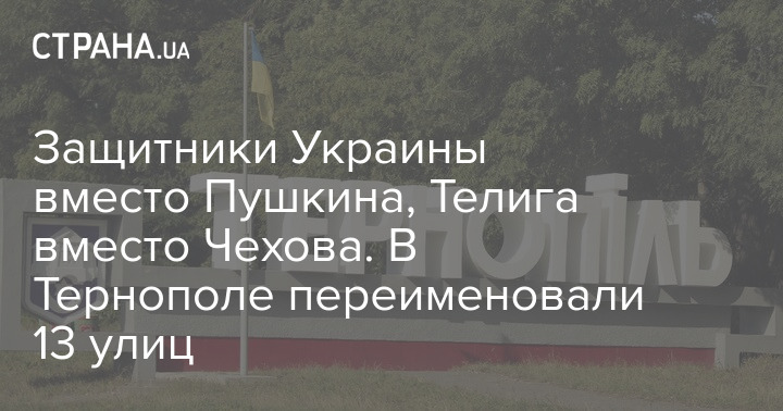 Улицу Чехова решили переименовать в честь Елены Телиги. Улица Пушкина получит название Защитников Украины. Вместо улицы Толстого в Тернополе теперь будет улица Евгения Мешковского (украинский военный, руководитель генерального штаба Армии УНР - Ред.).